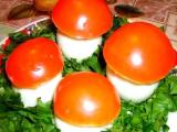 Желтки натереть на терке. Грибы проглядеть через мясорубку. Лук и помидоры мелко нарезать, обжарить на растительном масле, соединить с грибами и желтками, перемешать и полученной смешением плотно начинить белки.