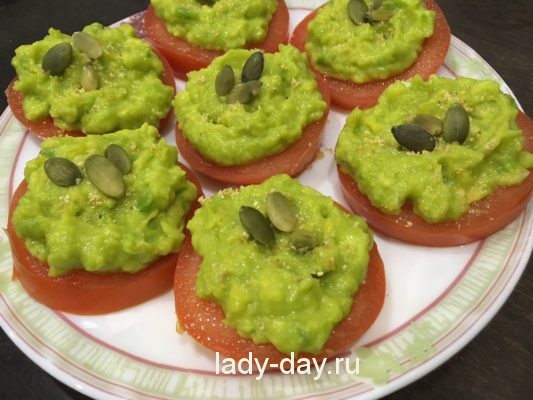 - Украшаем, салат из помидор и авокадо в облике закуски, тыквенными семечками, они придадут блюду пикантный вкус и увлекательный вид. Приятного аппетита!