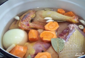 Промываем мясо и птицу. У петуха удаляем жирок золотого цвета. Очищаем овощи от кожуры. Рубим морковь на крупные кусочки. Заливаем все ингредиенты водой и устанавливаем вариться на 6 часов. Пенку снимаем, чтобы бульон не был мутным.