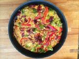 Продукты: 500 г филе свинины, 500 г брокколи или цветной капусты, соль, сахар, 2 сладких перца, по 2 ст. ложки кетчупа и майонеза, 50-70 г твердого влажна, растительное масло.