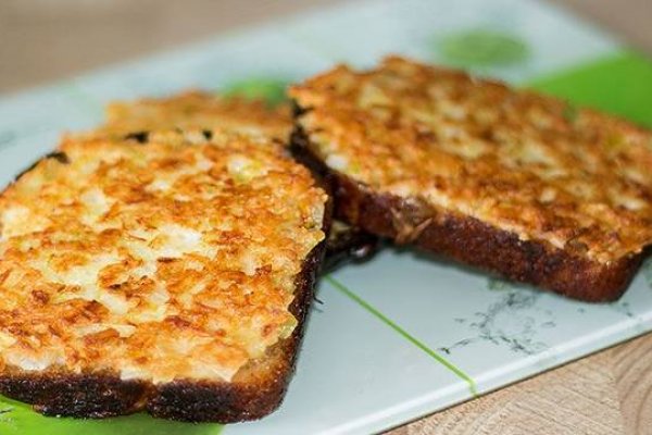 Намазать смешением ломтики хлеба, обжарить на заранее разогретом масле до румянца с двух сторонок. Начинать выкладывать бутерброды на сковороду нужно луком книзу.