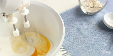 1. Приготовьте бисквит: белки вспушите миксером в пышную пену, после чего постепенно добавьте сахар, не прекращая взбивать массу. По одному добавьте желтки и вспушите миксером в течение 3 минут.
